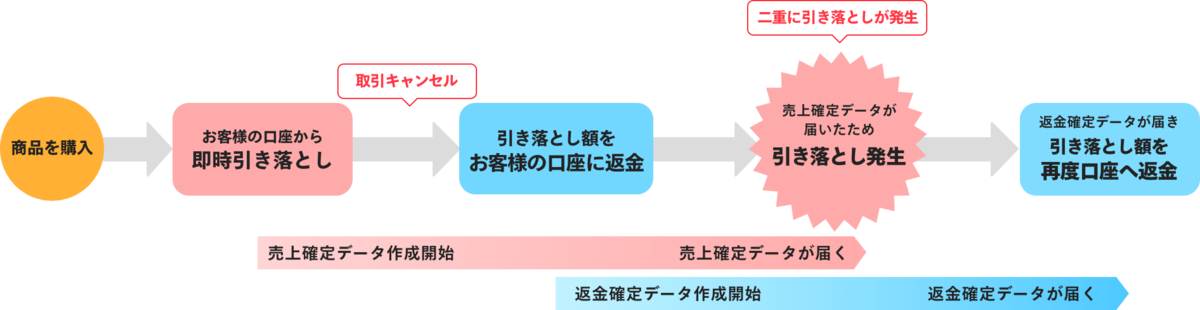 4, 返品確定データが届き、「3」で発生した引き落とし額を口座へ返金