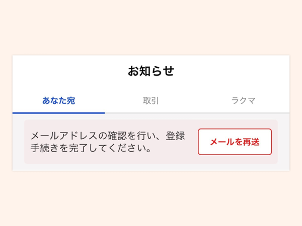 メールアドレスの確認が完了していない場合は、アプリ内の「お知らせ」に「メールを再送」と表示されています。